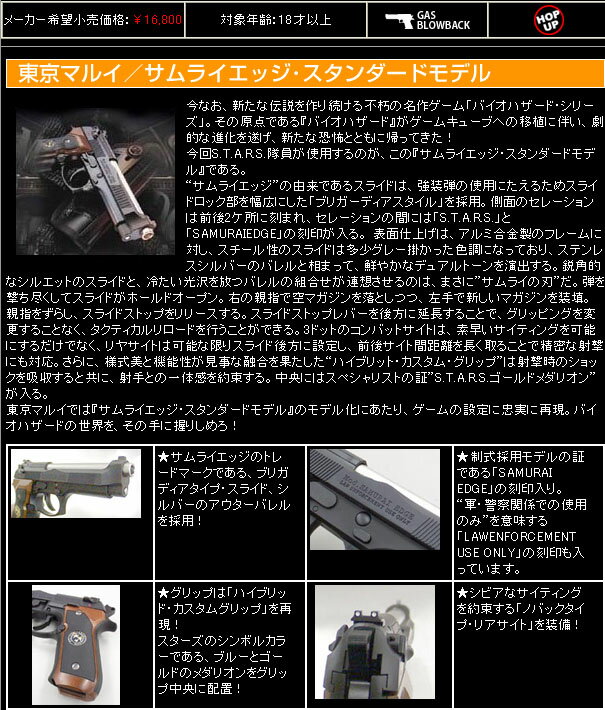 カプコンの人気ゲーム「バイオハザード」で活躍するハンドガン「サムライ・エッジ」がカタログモデルとして登場!主人公のクリスやジルが所属している「S.T.A.R.S.」の隊員たちに支給されたカスタムハンドガンを、ゲームでのイメージそのままに細部まで再現しました。